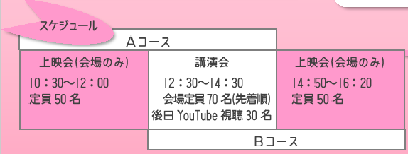 Aコース10:30~14:30 ①映画上映会+講演会会場参加 定員35名 (12:00~12:30休憩をはさむ)